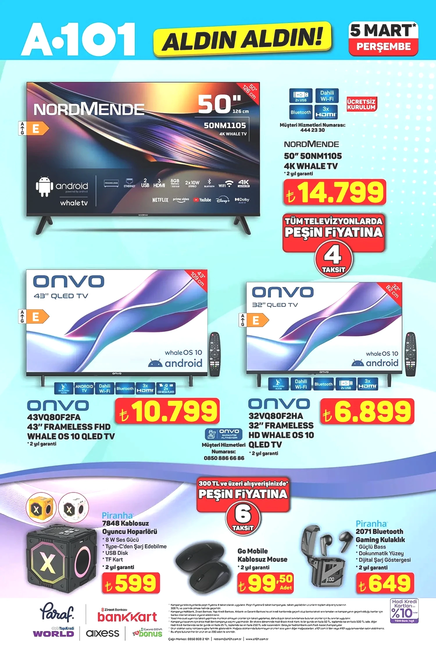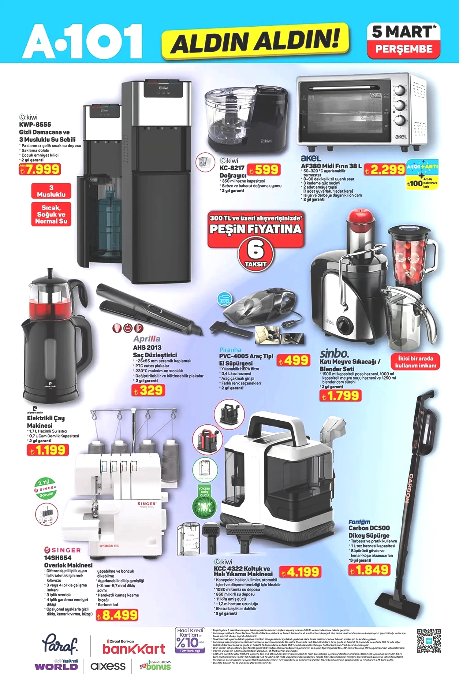 5 Mart 2026 Perşembe günü başlayacak olan ve hafta boyunca raflarda mevcut olacak A101 indirimlerinde, elektronik ürünler ve televizyonlar öne çıkıyor. Evde keyifli zaman geçirmenin en basit yollarından biri olan televizyon izleme deneyiminizi iyileştirecek büyük ekran akıllı televizyonlar bu hafta satışa sunulacak. Nordmende ve Onvo markalarının sunduğu 50 inç, 43 inç ve 32 inç seçenekleriyle farklı bütçe aralıklarına hitap eden akıllı televizyonlar dikkat çekiyor. Bu televizyonların fiyatları sırasıyla 14,799 TL, 10,799 TL ve 6,899 TL olarak belirlenmişken, ekran ve panel kaliteleriyle kullanıcıları etkilemeyi hedefliyor. Ayrıca sayfada Piranha kablosuz oyuncu hoparlörü, Bluetooth kulaklık ve kablosuz mouse gibi uygun fiyatlı teknolojik aksesuarlar da yer alıyor. Özellikle göz alıcı tasarımı ve 599 TL’lik fiyatıyla Piranha 7848 kablosuz oyuncu hoparlörü dikkat çekiyor. Diğer bir A101 5 Mart 2026 katalog sayfasında ise bu hafta pratik ev aletleri konusunda oldukça fazla çeşit yer alıyor. Haftanın en göz alıcı ürünlerinden biri Singer Overlok Makinesi; 8,499 TL fiyatıyla önemli bir fırsat sunuyor. Bunun yanı sıra Fantom dikey süpürgenin fiyatı 1,849 TL ve Kiwi’nin koltuk/halı yıkama makinesi 4,199 TL olarak belirlenmiş, böylece temizlik işleri kolaylık kazanıyor. Mutfak elektroniği tarafında da bir indirim fırsatı mevcut: Akel midi fırın 2,299 TL, Kiwi su sebili 7,999 TL, Sinbo katı meyve sıkacağı 1,799 TL ve çay makinesi 1,199 TL gibi fiyatlarla mutfaklarınız için vazgeçilmez ürünler oluyor.