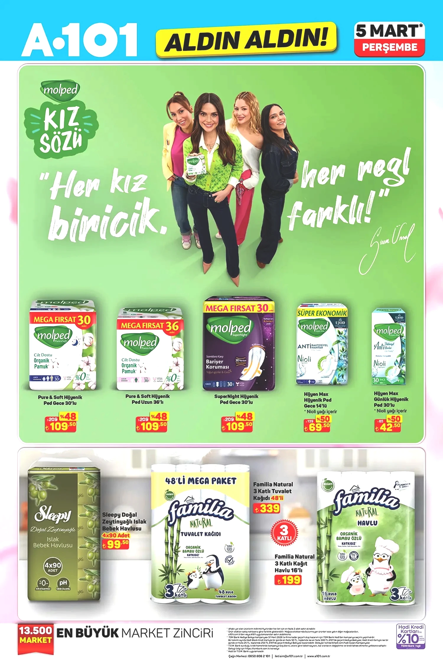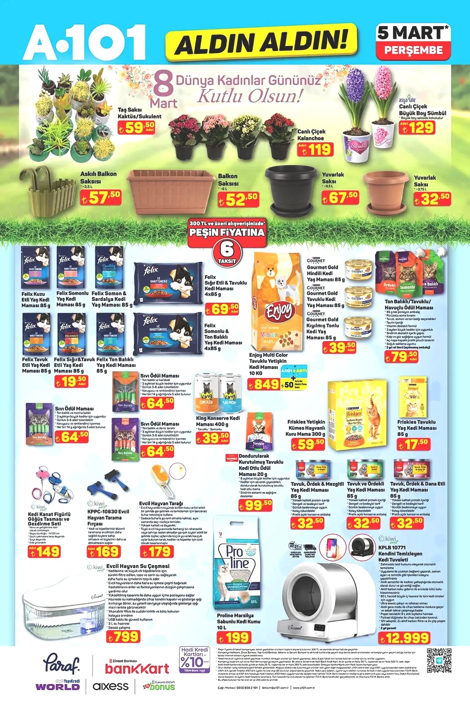 A101 Aktüel kataloğu, 5 Mart 2026 indirimleriyle bu yıl 8 Mart Dünya Kadınlar Günü'nü de unutmadı. Bu özel günde sunulacak bazı hediyelik ürünler market raflarını süslemeye başladı. Öncelikle kişisel bakım ürünündeki büyük indirimler dikkat çekiyor. Kozmetik ve Bakım kategorisinde Maybelline maskara ve göz kalemleri, Garnier cilt bakım serumları, micellar sular ve maskeler bu fırsatlar kapsamında indirimli fiyatlarla sunuluyor. Canlı çiçekler de indirim kapsamına alınıyor. Kadınlar Günü’nün vazgeçilmezlerinden olan saksı çiçekleri ile yapay gül buketleri ideal hediye alternatifleri olarak öne çıkıyor ve kadınlarımıza en anlamlı hediyeleri sunuyor. Bunun yanı sıra hijyen ürünleri de indirimde. Molped ped çeşitleri, Sleepy ıslak havlular ve Familia tuvalet kağıtları uygun fiyatlarla raflarda yer alıyor.