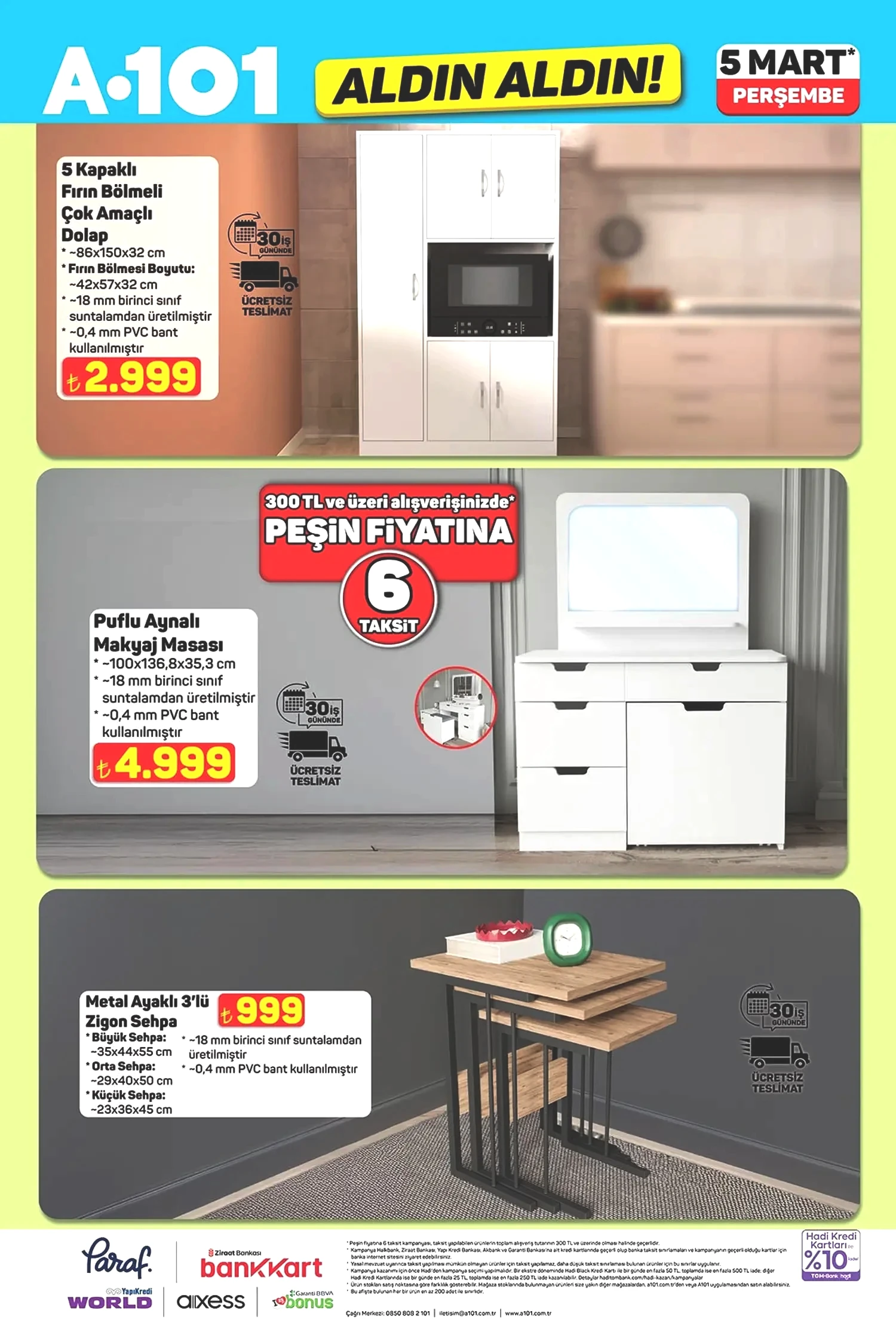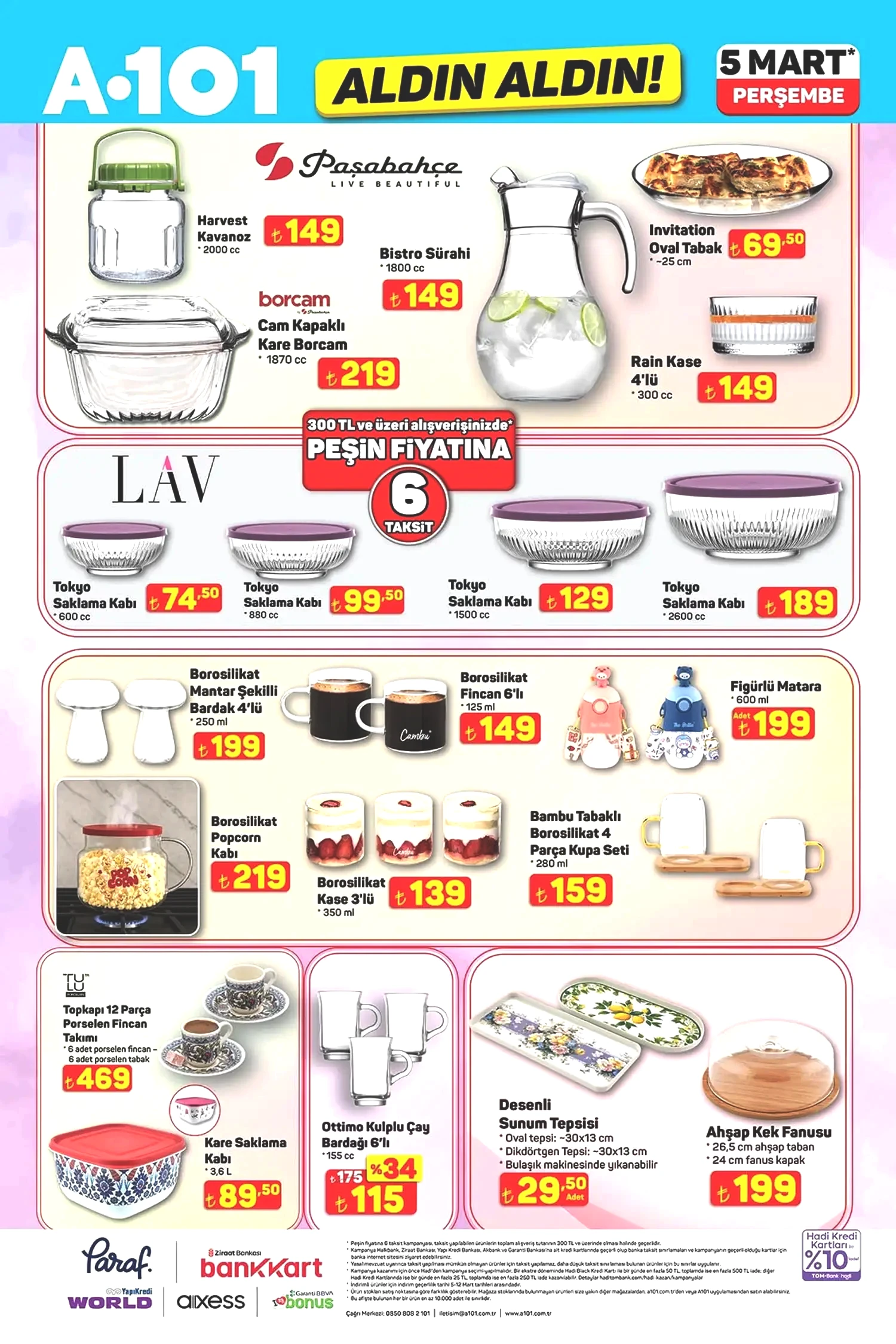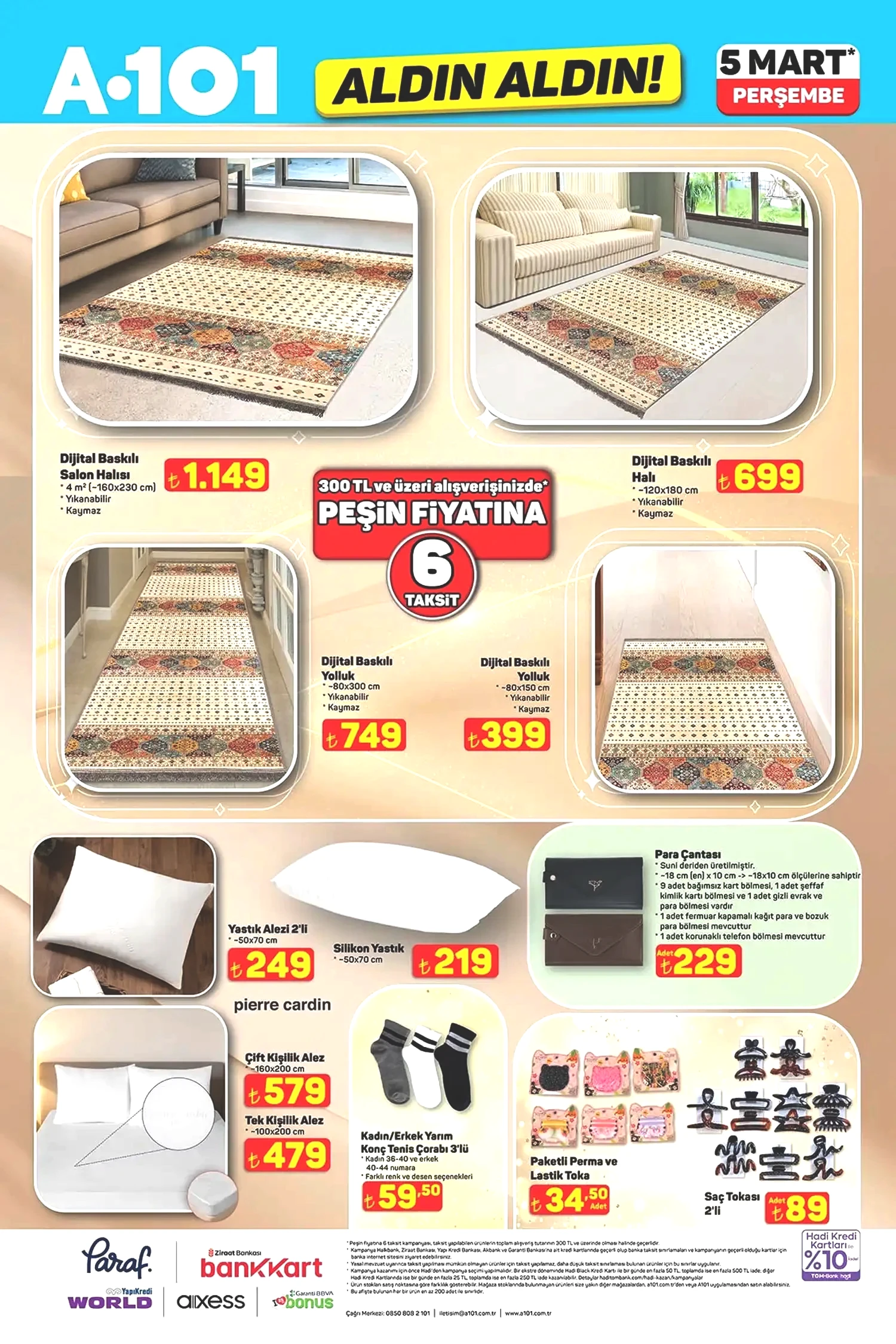 5 Mart 2026 A101 kataloğunun, şimdiden indirim meraklılarını cezbedeceği aşikar. Sunulan fırsatlar, mobilya, ev tekstili ve düzenleyiciler ile devam etmekte. Mobilya kategorisinde yer alan puf ayaklı makyaj masası 4,999 TL, metal ayaklı zihon sehpa ise 889 TL’ye ulaşacak. Ev Tekstili bölümünde dijital baskılı salon halıları, yolluklar, yastıklar ve alez çeşitleri yer alıyor. Bunun yanı sıra mutfak züccaciye ürünlerinde Paşabahçe ve LAV markalarının şık cam kaseleri, bardakları, saklama kapları ve zarif çelik termosları da satışta olacak. Ayrıca oyuncaklar, mopedler ve daha birçok farklı fırsat ürünü yine A101 raflarında sizleri bekliyor. 5 Mart A101 kataloğunda evcil hayvan dostlarımız da unutulmamış. Felix, Enjoy gibi markalardan kedi ve köpek mamaları indirimli fiyatlarla sunulurken, Proline kedi kumu, otomatik su şelalesi, mama kapları ve evcil hayvan taşıma/bakım aksesuarları da bu fırsatları artırıyor. Piyasa fiyatlarına kıyasla oldukça makul seviyelerde bulunan bu ürünleri değerlendirip değerlendirmemek tamamen sizin tercihinize kalmış. Daha fazla indirim ve kampanya için gelişmeleri takip etmeye devam edin. Şimdi de sizleri 5 Mart A101 kataloğu ile baş başa bırakalım!