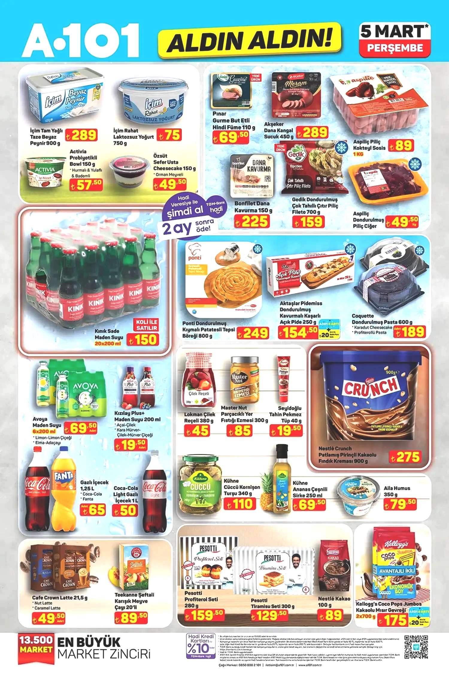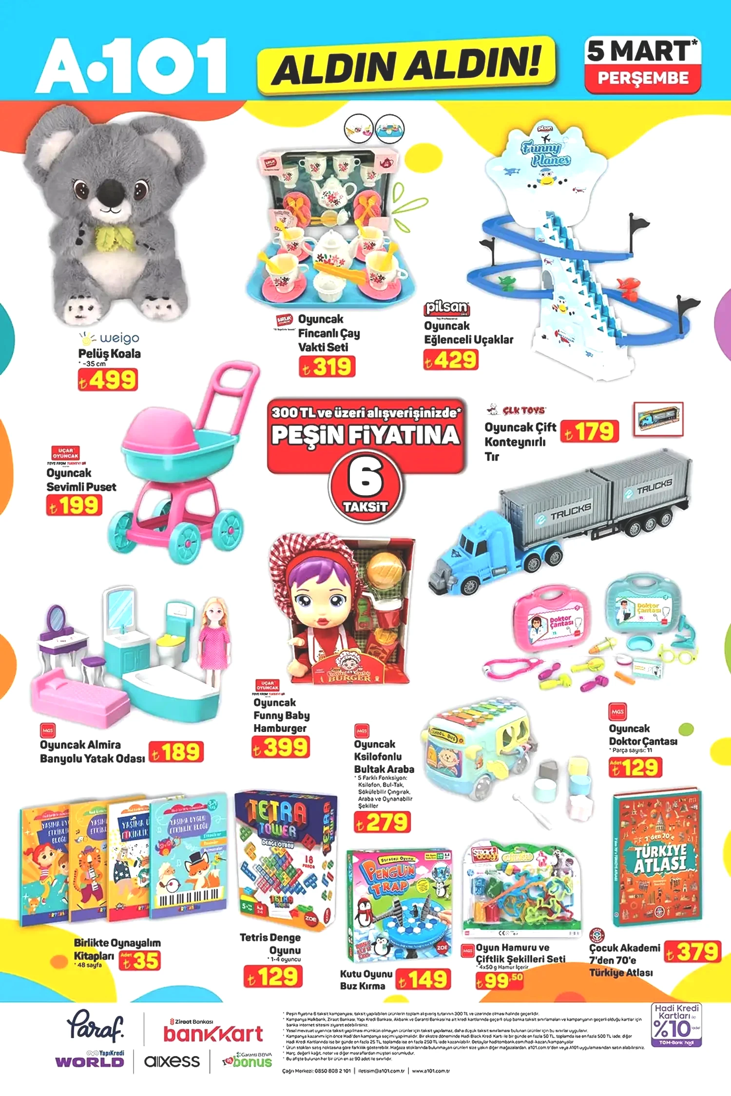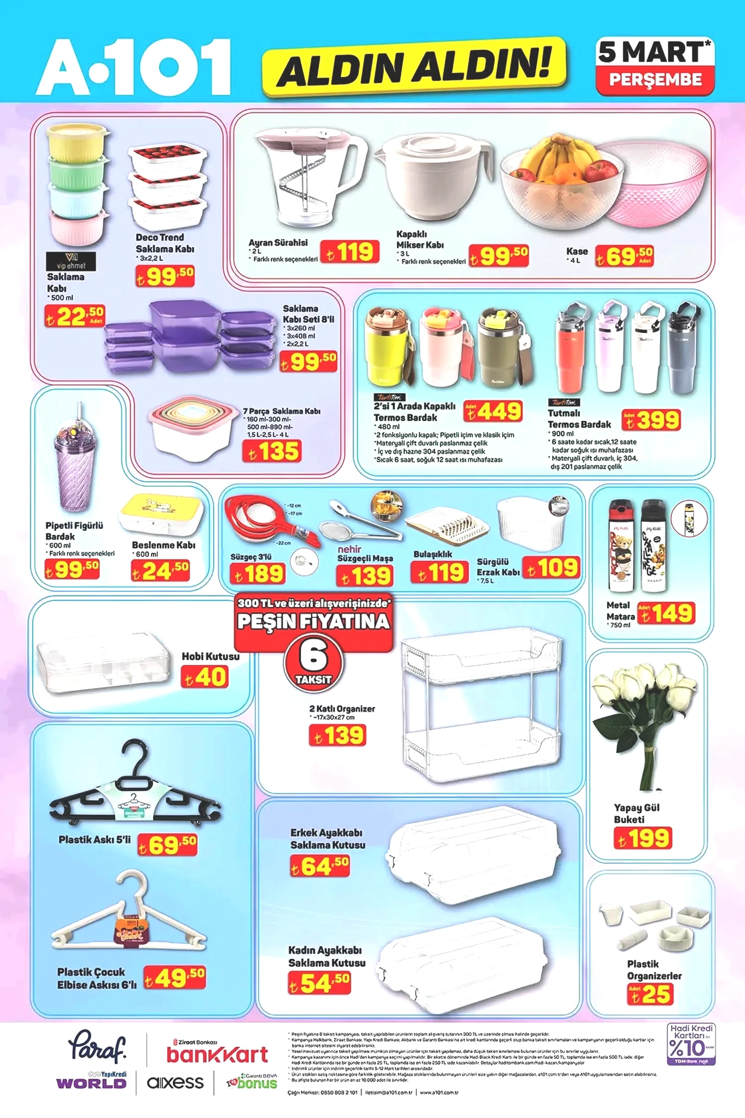 5 Mart 2026 A101 kataloğunun, şimdiden indirim meraklılarını cezbedeceği aşikar. Sunulan fırsatlar, mobilya, ev tekstili ve düzenleyiciler ile devam etmekte. Mobilya kategorisinde yer alan puf ayaklı makyaj masası 4,999 TL, metal ayaklı zihon sehpa ise 889 TL’ye ulaşacak. Ev Tekstili bölümünde dijital baskılı salon halıları, yolluklar, yastıklar ve alez çeşitleri yer alıyor. Bunun yanı sıra mutfak züccaciye ürünlerinde Paşabahçe ve LAV markalarının şık cam kaseleri, bardakları, saklama kapları ve zarif çelik termosları da satışta olacak. Ayrıca oyuncaklar, mopedler ve daha birçok farklı fırsat ürünü yine A101 raflarında sizleri bekliyor. 5 Mart A101 kataloğunda evcil hayvan dostlarımız da unutulmamış. Felix, Enjoy gibi markalardan kedi ve köpek mamaları indirimli fiyatlarla sunulurken, Proline kedi kumu, otomatik su şelalesi, mama kapları ve evcil hayvan taşıma/bakım aksesuarları da bu fırsatları artırıyor. Piyasa fiyatlarına kıyasla oldukça makul seviyelerde bulunan bu ürünleri değerlendirip değerlendirmemek tamamen sizin tercihinize kalmış. Daha fazla indirim ve kampanya için gelişmeleri takip etmeye devam edin. Şimdi de sizleri 5 Mart A101 kataloğu ile baş başa bırakalım!