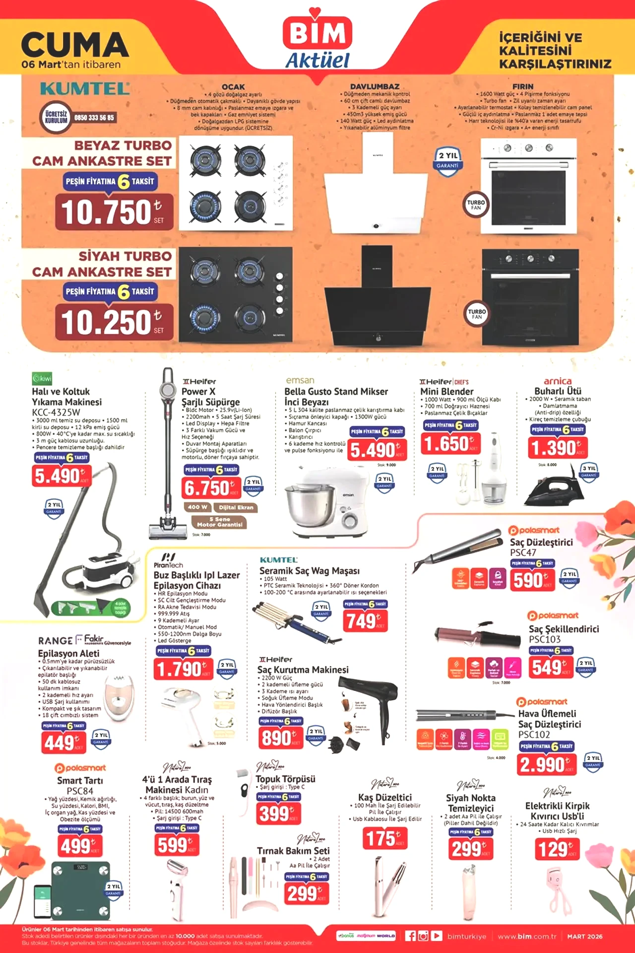Bim Aktüel kataloğunda, 6 Mart 2026 tarihinin en dikkat çekici ürünleriyle başlayalım. Mutfağın vazgeçilmez elektrikli aletlerinden ankastre setlerinde, Kumtel yine öne çıkıyor. 10.750 TL fiyatıyla beyaz turbo cam set ve 10.250 TL etiketli siyah versiyonu marketin raflarında yer alacak. Diğer markaların fiyatlarının hızla yükseldiği günümüzde, Kumtel’in geniş servis ağı ve yedek parça bulunabilirliği düşünüldüğünde, bu setler özellikle kiracılar ve yazlık sahipleri için makul bir alternatif olabilir. Ayrıca montaj konusunu iyice araştırmanın önemli olduğunu belirtmekte fayda var. Yanında bulunan Heifer Power X şarjlı süpürge ise 6.750 TL fiyat etiketiyle, yüksek fiyatlı Dyson gibi ürünlere ihtiyaç duyulup duyulmadığını sorgulatıyor. Günlük temizlik ve kırıntı toplama amacıyla bu dikey süpürgeler artık çoğu evin temel bir parçası haline geldi. Artık robot süpürgelerin yerini almaya başlayan bu modeller, temizlik demişken, 5.490 TL fiyatla sunulan halı ve koltuk yıkama makinesi de evde evcil hayvan besleyenler ya da halı yıkamaktan yorulanlar için büyük kolaylık sağlayabilir.