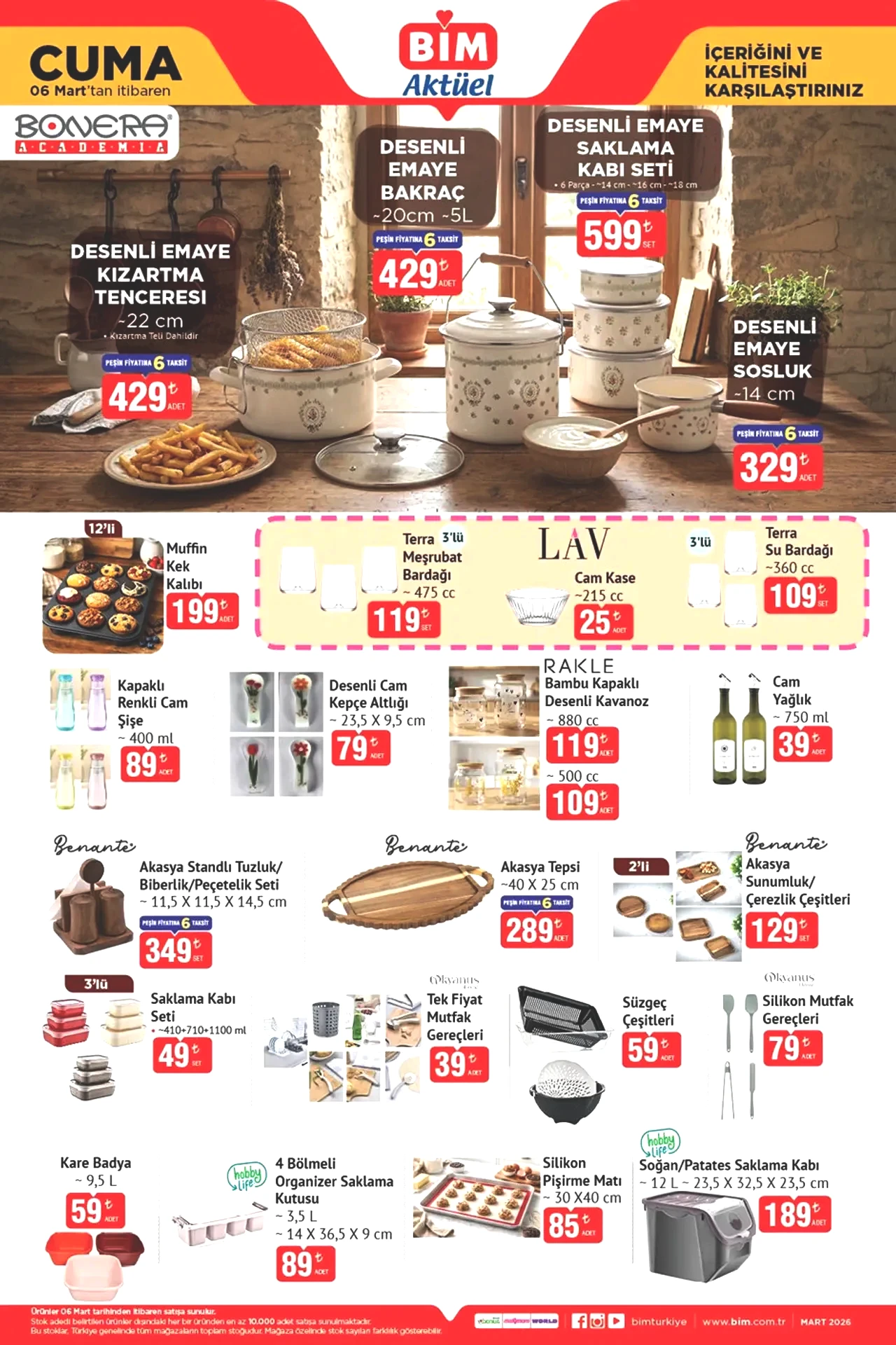 BİM 6 Mart kataloğunda bunların yanı sıra çeşitli yumaklar, tekstil ve giyim ürünleriyle de ilgi çekici detaylar bulunmakta. Kısacası; 6 Mart Cuma günü BİM mağazalarında özellikle ankastre setler, halı yıkama makinesi ve saç şekillendirici için sabah saatlerinde yoğunluk yaşanabileceği öngörülüyor. Eğer arayışınız büyük beyaz eşyalar ise, acele etmenizde fayda var. Ancak tabak, bardak ya da tekstil ürünleri için gün içinde de şansını deneyebilirsiniz. Tabii bu konuda kimse bir şey garanti edemez! Bütçenizi zorlamadan evinizin eksiklerini tamamlamak istiyorsanız, bu Cuma BİM’i ziyaret etmeden geçmemenizi öneriyoruz. Şimdiden iyi alışverişler dileriz.